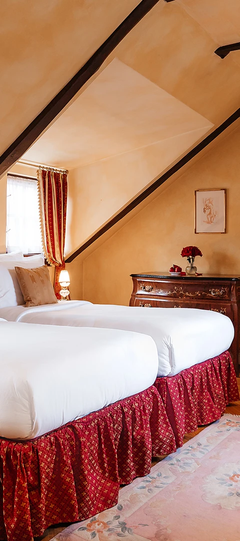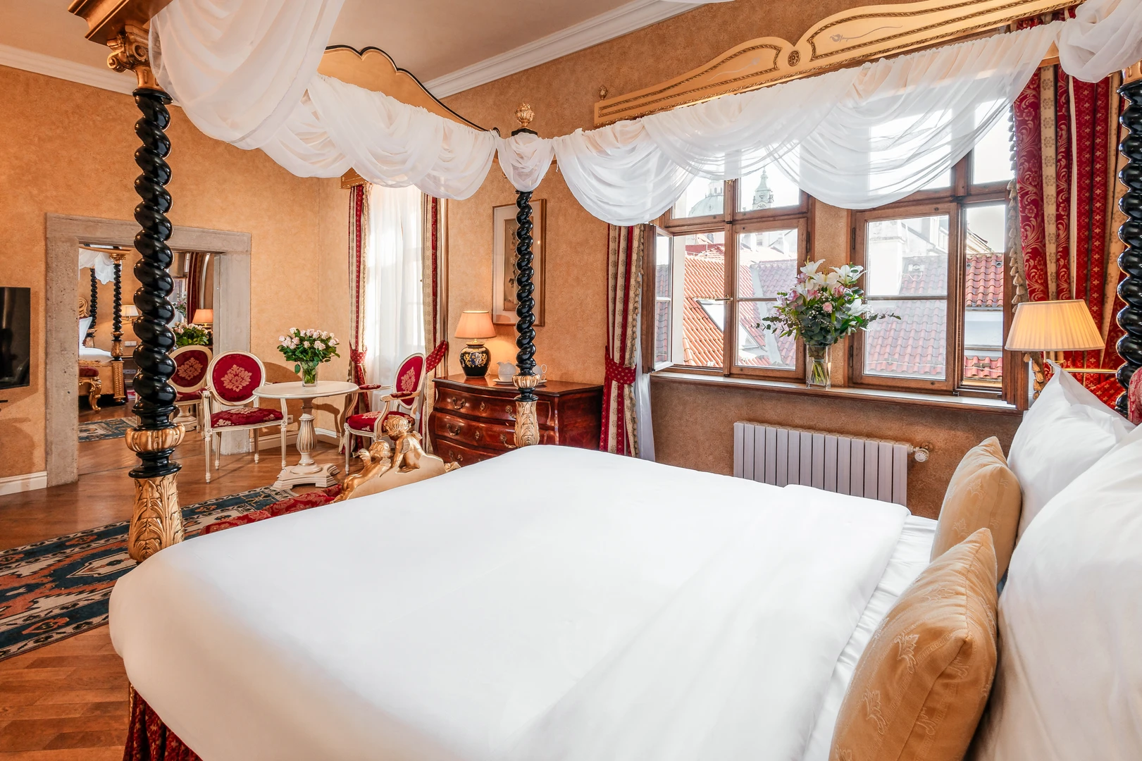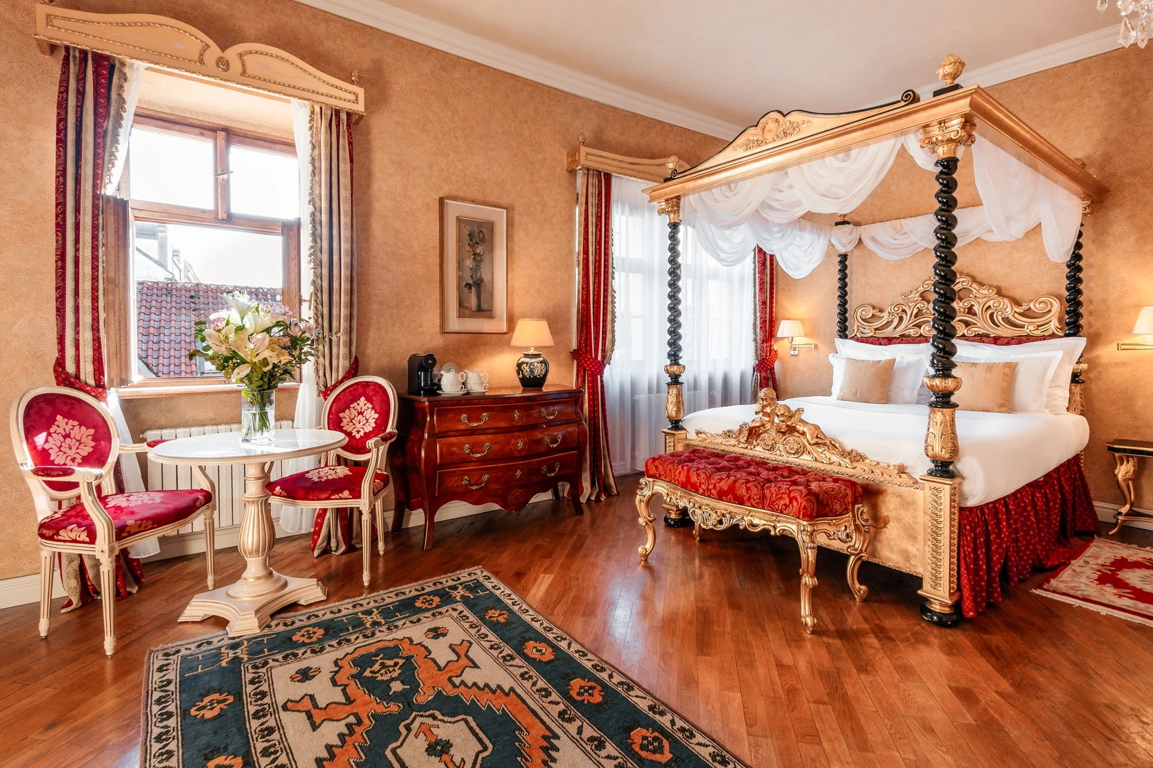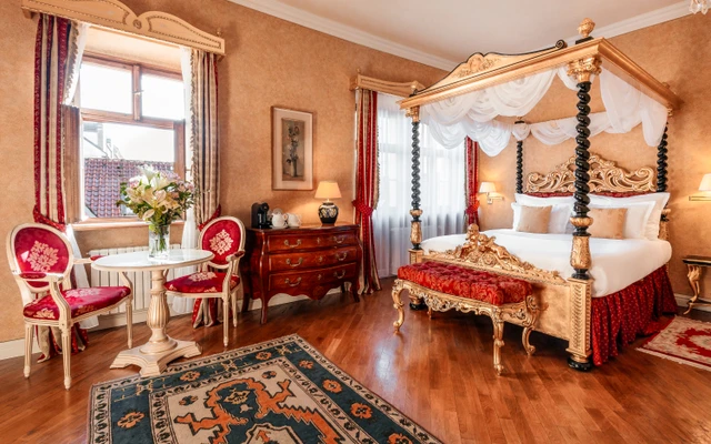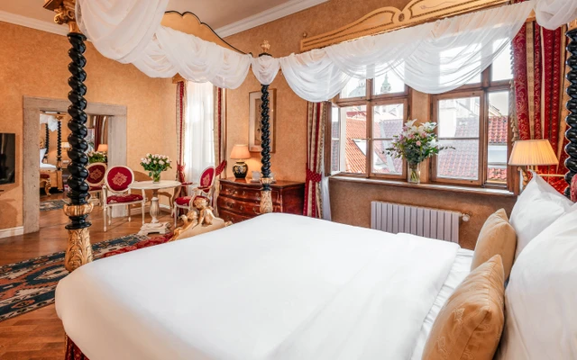 Indulge in the charm and sophistication of our romantic one bedroom suite, featuring stunning Gothic ceilings. The highlight of the Alchymist Suite is the exquisite marble bathroom with a centrally placed bathtub.