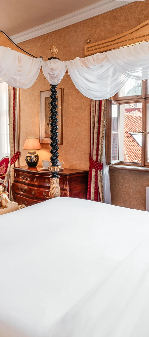 Indulge in the elegance of our Tower Suite, located on the top floor. It has two bedrooms and boasts some special features. The nice views of St. Nicolas Church and the rooftops of Prague make the stay in the Tower Suite truly unforgettable.